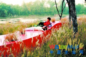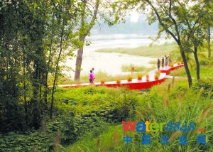 東岸:因?yàn)轳g岸較緩,主要采用植物護(hù)岸,栽植一定量的蘆葦、香蒲等挺水植物,既能消除游船所形成的波浪對(duì)駁岸產(chǎn)生的不良影響,也起到了穩(wěn)定岸線的功能。