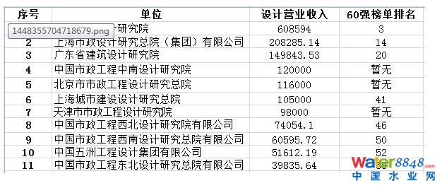得知中南院實(shí)際情況后,中國水網(wǎng)又致電北京院及天津院詢問營收情況,方知這兩大設(shè)計(jì)院也是本著“虛名皆浮云”的心態(tài),沒有參與到上述評選中。而在2014年,北京院的設(shè)計(jì)營收為11.6億,天津院的設(shè)計(jì)營收為9.8億,毫不遜色。為此,中國水網(wǎng)特將市政環(huán)保類設(shè)計(jì)企業(yè)榜單更新如下: