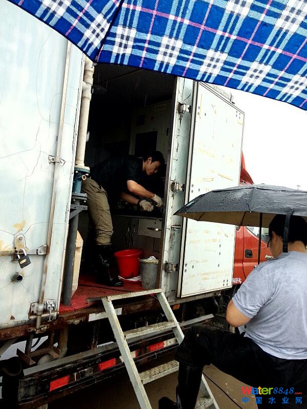 工作人員冒雨進(jìn)行破氰廢水實(shí)驗(yàn)