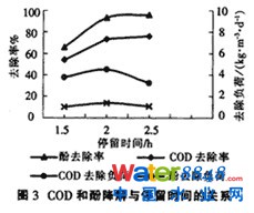 圖3描述了停留時(shí)間對(duì)COD和酚降解的影響情況,可知,在一定范圍內(nèi),停留時(shí)間對(duì)COD和酚的去除率影響不大,均有較好的出水水質(zhì)和較高的去除率;進(jìn)一步發(fā)現(xiàn),當(dāng)停留時(shí)間從2.5h減小到2.0h后,COD的平均去除率雖由76.0%降到73.6%,但它的去除負(fù)荷卻由3.22kg/(m.d) 升高到4.49kg/(m·d);酚的平均去除率雖由95.5%降到93.8%,但它的去除負(fù)荷卻由1.08 kg/(m3.d) 升高到1.39kg/(m3·d);但是,如果停留時(shí)間再進(jìn)一步減小到1.5h,則降解效果明顯下降。本實(shí)驗(yàn)的目的在于尋求一種高效的含酚廢水的處理方式及較適宜的水力停留時(shí)間,使大部分的COD尤其酚得到降解,防止這些污染物在后續(xù)的綜合生化處理中產(chǎn)生沖擊,顯然,當(dāng)水力停留時(shí)間為2.0h時(shí),就已經(jīng)達(dá)到了目的:出水中酚的平均質(zhì)量濃度為8.5 mg/L,平均去降率達(dá)到93%,而且此時(shí)COD和酚的去除負(fù)荷相對(duì)也大。