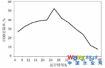 工程運(yùn)行幾個(gè)月后,曝氣生物濾池水力負(fù)荷達(dá)到3. 0 kg /m3˙d,反沖洗周期24 h 后,反沖洗氣沖強(qiáng)度控制在20 ~ 30 Nm3 /min ,氣水聯(lián)合沖洗5 min,對(duì)COD 有較高的去除效果,平均去除率高達(dá)51%。