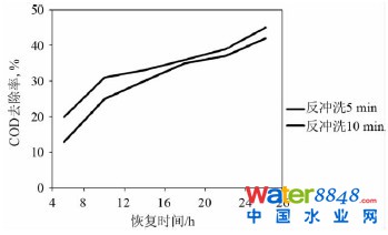 這里所討論的反沖洗時(shí)間為氣水聯(lián)洗階段的時(shí)間。在BAF 反沖洗的過(guò)程中,水反沖洗強(qiáng)度、氣反沖洗強(qiáng)度和氣水同時(shí)反沖洗時(shí)間對(duì)反沖洗效果有較大的影響,而氣水同時(shí)反沖洗是氣水聯(lián)合反沖洗過(guò)程中最關(guān)鍵的一步。為摸索最適合的反沖洗時(shí)間,固定水反沖強(qiáng)度和氣沖強(qiáng)度,分別考查反沖洗時(shí)間為5 min、10 min 條件下BAF 對(duì)COD 的去除效果。