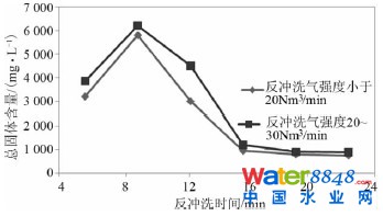 根據(jù)有關(guān)資料,氣反沖效率的影響明顯大于水沖強(qiáng)度變化的影響。因此,這里只考查了氣沖強(qiáng)度變化對(duì)反沖洗的影響。首先固定水沖強(qiáng)度,對(duì)比反沖洗氣強(qiáng)度在20 ~ 40 m3 /min 的氣沖效率,通過(guò)分析反沖洗液中的總固體含量來(lái)選擇控制范圍。