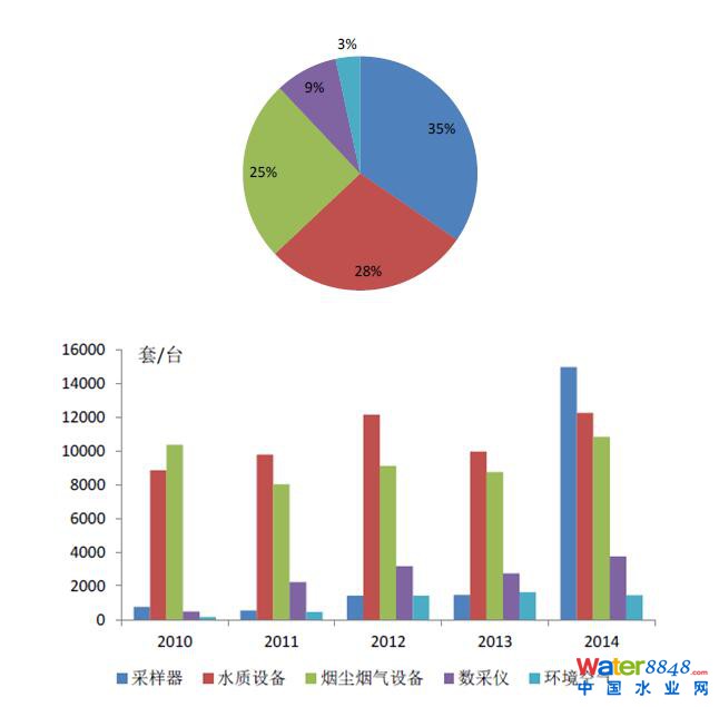 從2014年我國環(huán)境監(jiān)測(cè)市場(chǎng)的產(chǎn)品結(jié)構(gòu)來看,作為基礎(chǔ)設(shè)備的采樣器市場(chǎng)銷量占比最大,其次為水質(zhì)設(shè)備和煙塵煙氣設(shè)備,占比分別在28%和25%,作為連接監(jiān)測(cè)儀器和數(shù)據(jù)分析系統(tǒng)紐帶的數(shù)據(jù)采集儀銷量占比9%,而另一個(gè)細(xì)分行業(yè)的環(huán)境空氣的市場(chǎng)銷量占比最小,僅有3%。