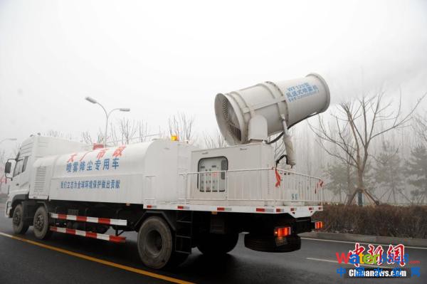 12月1日,多功能抑塵車在河北廊坊大廠回族自治縣進行噴霧抑塵作業(yè)。當日中央氣象臺繼續(xù)發(fā)布霾橙色預警,河北中南部地區(qū)有重度霾。為保障空氣質(zhì)量,該地出動多功能抑塵車,通過內(nèi)循環(huán)作業(yè),利用該車的噴灑系統(tǒng)向空中發(fā)射水霧的方式,將漂浮在空氣中的污染顆粒物迅速逼降地面,凈化空氣。