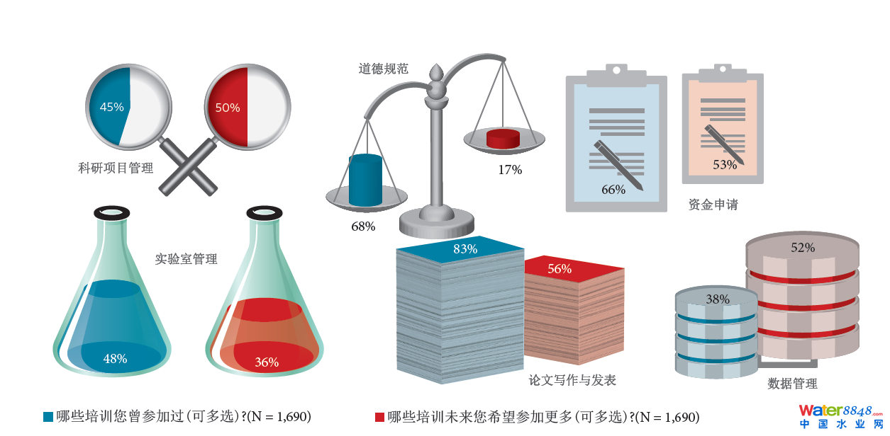 圖5.大部分中國科學(xué)家在實驗室管理、數(shù)據(jù)管理和科研項目管理方面的培訓(xùn)還不夠,而在論文寫作和發(fā)表方面,培訓(xùn)質(zhì)量有待提高
