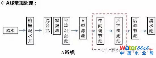 羅涇水廠設計總規(guī)模20萬噸/天,一期工程10萬噸/天,分A、B兩線工藝,其中A線為常規(guī)工藝(8萬噸)、B線為深度處理工藝(2萬噸)。