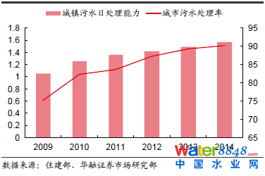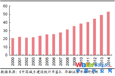 此次修訂稿的發(fā)布,也正式拉開了污水處理廠提標(biāo)改造的序幕。近年來(lái),我國(guó)城鎮(zhèn)污水處理率不斷提升,截至2014 年底,城市污水處理率達(dá)到90.18%,污水處理廠集中處理率為85.94%。排放標(biāo)準(zhǔn)的大幅提高預(yù)計(jì)將開啟污水廠的升級(jí)改造, 有望在2016-2017 年釋放大量需求。
