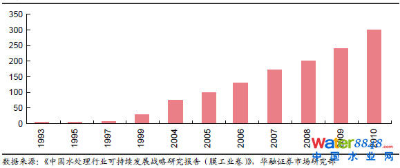 目前全球膜市場(chǎng)規(guī)模不斷增大,預(yù)計(jì)到2020 年,全球膜法水處理膜組器及工程市場(chǎng)規(guī)模將達(dá)到800 億美元。我國(guó)膜產(chǎn)業(yè)發(fā)展同樣迅速,已經(jīng)成為繼歐洲、北美后全球第三大水處理市場(chǎng)。2010 年,我國(guó)膜產(chǎn)值超過300 億元,占全球膜市場(chǎng)的10%左右。根據(jù)中國(guó)膜工業(yè)協(xié)會(huì)的《中國(guó)膜行業(yè)“十三五”戰(zhàn)略發(fā)展規(guī)劃》編制思路,“十三五”期間,膜產(chǎn)業(yè)將實(shí)現(xiàn)產(chǎn)值翻番,年均增長(zhǎng)20%左右。“十三五” 末期功能膜產(chǎn)值突破2500 億元,出口實(shí)現(xiàn)100 億元/年。