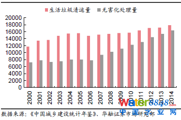 相比發(fā)達(dá)國(guó)家對(duì)于固廢處理的“資源化”,我國(guó)仍以“無(wú)害化”處理為主。在處理技術(shù)方面,我國(guó)城市生活垃圾處理主要采用填埋的方式。從目前我國(guó)城市生活垃圾處理現(xiàn)狀來(lái)看,雖然無(wú)害化處理能力逐年增長(zhǎng),但仍未達(dá)到全部無(wú)害化處理, 距離《“十二五”全國(guó)城鎮(zhèn)生活垃圾無(wú)害化處理設(shè)施建設(shè)規(guī)劃》中提出的“到2015 年,直轄市、省會(huì)城市和計(jì)劃單列市生活垃圾全部實(shí)現(xiàn)無(wú)害化處理,設(shè)市城市生活垃圾無(wú)害化處理率達(dá)到90%以上,縣縣具備垃圾無(wú)害化處理能力,縣城生活垃圾無(wú)害化處理率達(dá)到70%以上”目標(biāo)仍存在一定差距,可見行業(yè)市場(chǎng)前景仍舊可觀。