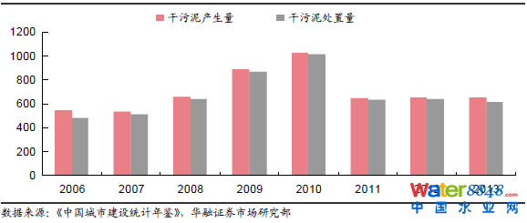 圖表9:全國(guó)城市污水處理廠干污泥產(chǎn)生量、處理量(萬(wàn)噸/年)