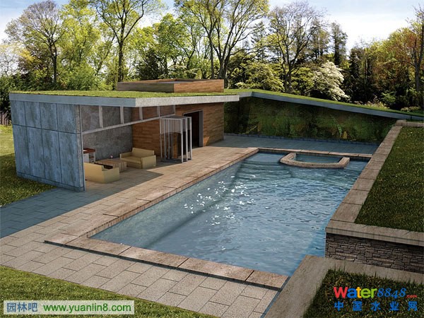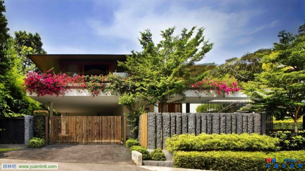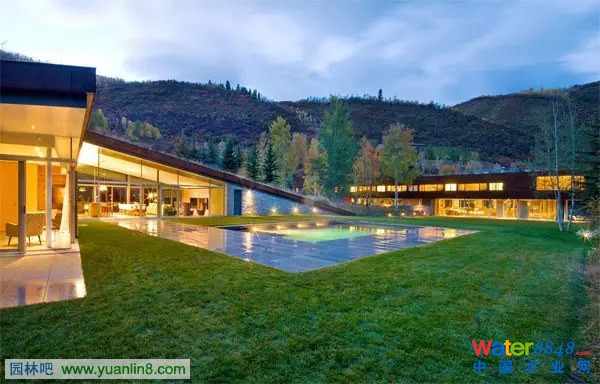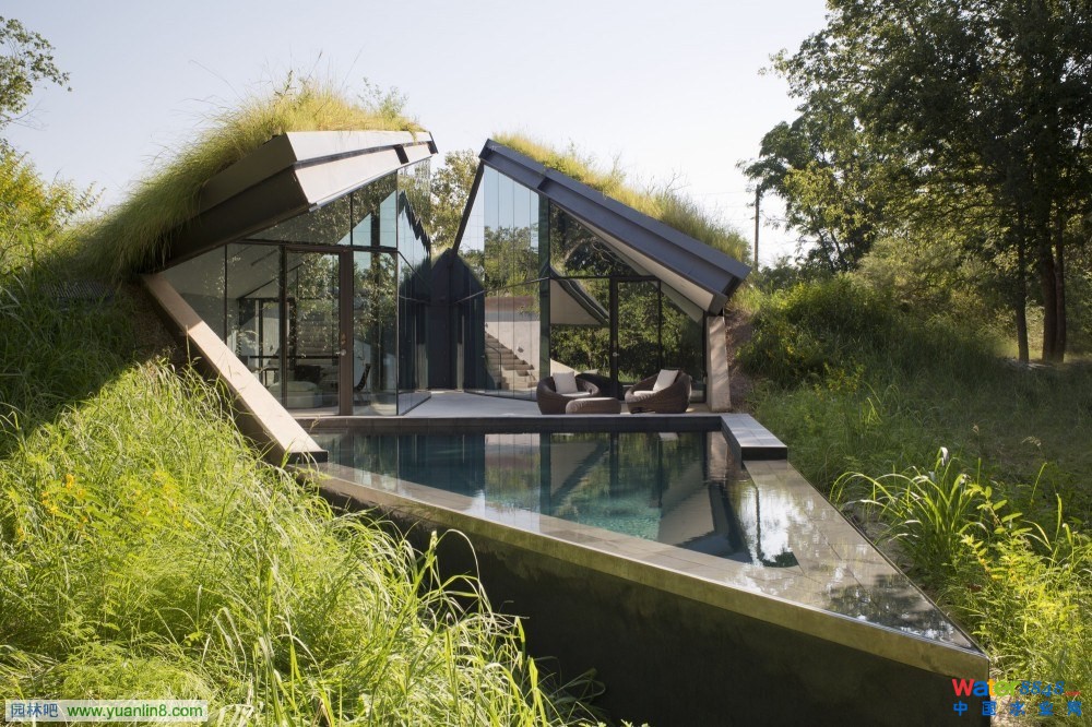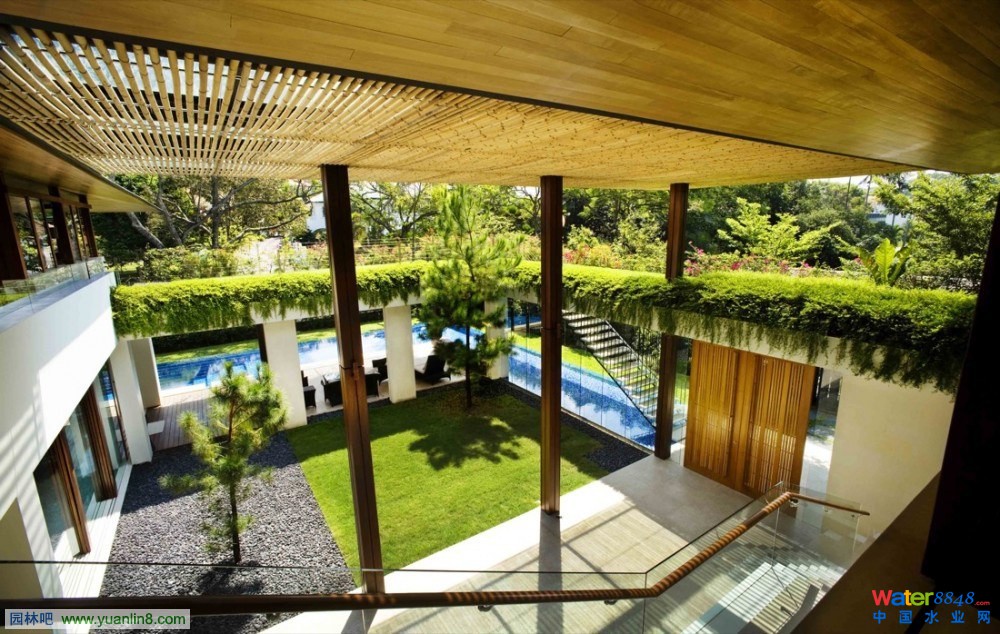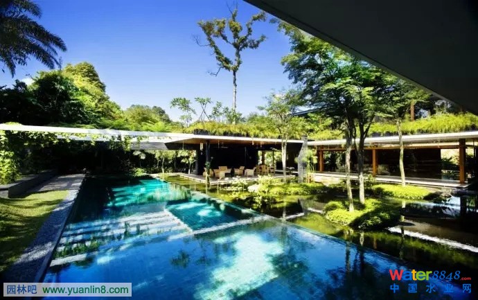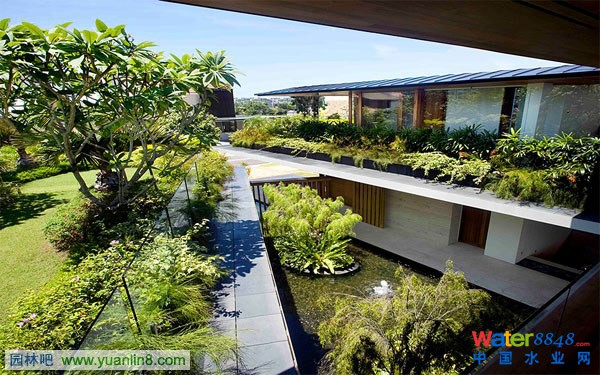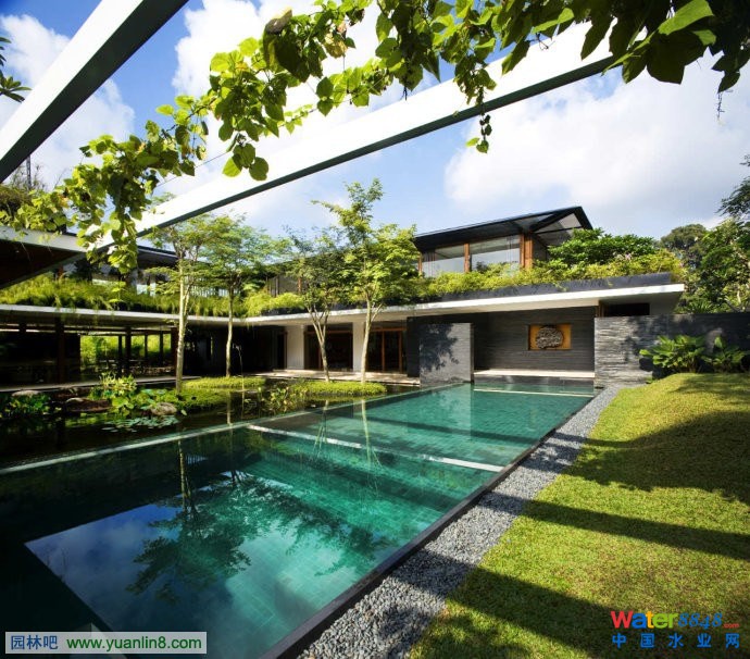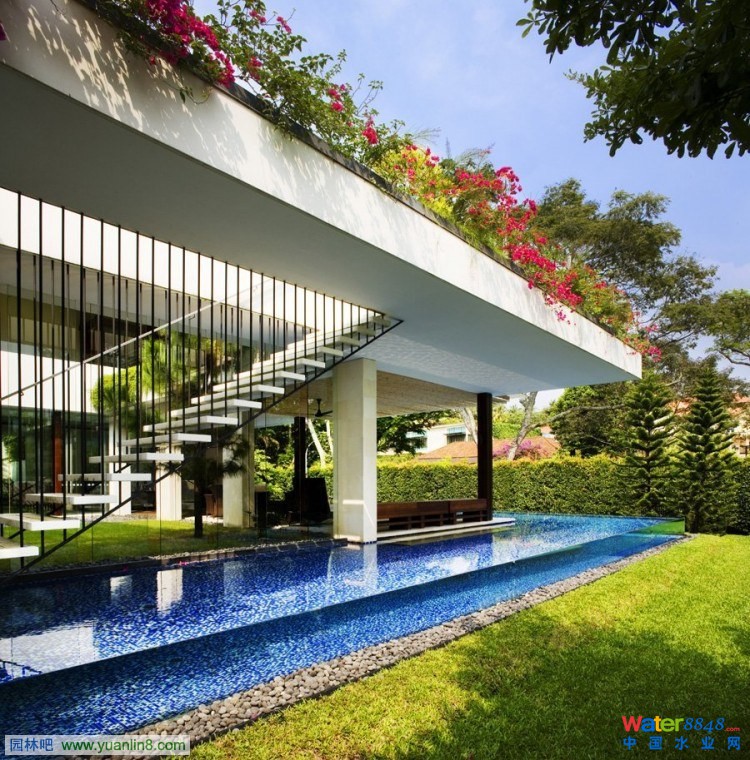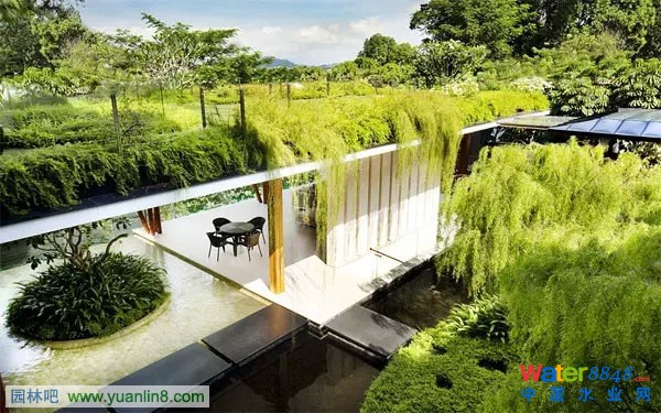 最好的景觀設(shè)計永遠不能沒有池塘或水的設(shè)計, GUZ Architects設(shè)計這套建在經(jīng)過園藝美化的場地上的重疊式結(jié)構(gòu)的豪宅,波光麟麟的水池的庭院,屋頂上“溢出”到花園中的植物,心醉。