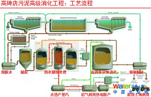 這是高碑店簡單的流程圖。設(shè)計污泥經(jīng)過預(yù)脫水和儲泥混合,然后是熱水解預(yù)處理,經(jīng)過熱水解系統(tǒng)再經(jīng)過普拉克兩級化熱,化熱到40度,進(jìn)入到普拉克的厭氧反應(yīng)器,厭氧反應(yīng)器產(chǎn)生的沼氣,一部分供鍋爐使用,多余的沼氣用來發(fā)電。高碑店項目設(shè)計的是2400千瓦,厭氧消化產(chǎn)生的消化液通過板框脫水,脫水干度能夠達(dá)到40%,干化后的污泥能夠達(dá)到衛(wèi)生局指標(biāo),能夠滿足土地利用的要求。