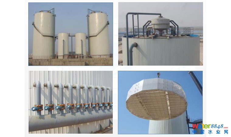 進(jìn)水經(jīng)過(guò)布水器(10)輸入反應(yīng)器,與下降管(7)循環(huán)來(lái)的污泥和水均勻混和后,進(jìn)入第一個(gè)反應(yīng)區(qū),即流化床反應(yīng)室(4)。在那里,大部分COD被降解為沼氣,在這個(gè)反應(yīng)區(qū)產(chǎn)生的沼氣由一級(jí)三相分離器(6)收集和分離,并產(chǎn)生氣體提升。氣體被提升的同時(shí),帶動(dòng)水和污泥作向上運(yùn)動(dòng),經(jīng)過(guò)“上升”管(3)達(dá)到位于反應(yīng)器頂部的氣體/液體分離器(1),在這里沼氣從水和污泥中分離,離開(kāi)整個(gè)反應(yīng)器。 水和污泥混和經(jīng)過(guò)同心的“下降”管(7)直接滑落到反應(yīng)器底部形成內(nèi)部循環(huán)流。第一級(jí)反應(yīng)區(qū)的出水在第二階段低負(fù)荷后處理區(qū)(2)內(nèi)被深度處理,在那里剩余的 可厭氧生物降解的COD被去除,在上層分離區(qū)產(chǎn)生的沼氣被頂部的二級(jí)三相分離器(8)收集,并由“集氣管”輸送到頂部旋流式氣體/液體分離器(1),實(shí)現(xiàn)沼氣分離和收集。同時(shí),厭氧出水經(jīng)過(guò)出水堰離開(kāi)反應(yīng)器自流進(jìn)入后續(xù)處理中。
