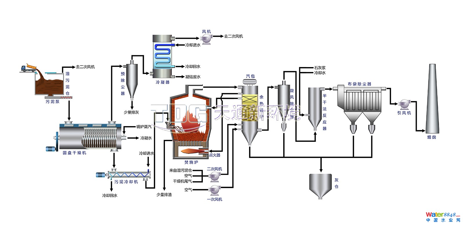 污泥干化焚燒綜合體系的關(guān)鍵技術(shù)是降低污泥的水分,污泥熱干化是降低污泥水分的較好辦法,在日本、歐美等國已有相當(dāng)多的實用例證,主要設(shè)備均有工程實用。焚燒系統(tǒng)主要包括以下操作單元組成:污泥輸送系統(tǒng)、污泥干化系統(tǒng)、焚燒爐、余熱蒸汽鍋爐、煙氣處理系統(tǒng)、灰分收集及輸送系統(tǒng)等組成。