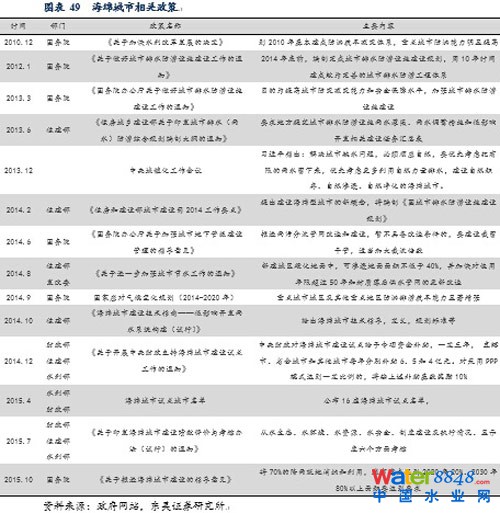 早在2013年12月,習(xí)近平總書記在中央城鎮(zhèn)化工作會議上已經(jīng)提出建設(shè)自然積存、自然滲透、自然凈化的“海綿城市”;2014年住建部發(fā)布《海綿城市建設(shè)技術(shù)指南》為海綿城市建設(shè)提供方向;2015年4月2日,財政部、住建部和水利部發(fā)文公布首批16個海面城市試點,遷安、白城、鎮(zhèn)江、嘉興、池州、廈門、萍鄉(xiāng)、濟南、鶴壁、武漢、常德、南寧、重慶、遂寧、貴安新區(qū)和西咸新區(qū)獲得首批資格,拉開了海綿城市的建設(shè)序幕。中央財政對海綿城市建設(shè)試點給予專項資金補助,一定三年,直轄市、省會城市和其他城市每年分別補助6、5和4億元。對采用PPP模式達到一定比例的,將按上述補助基數(shù)獎勵10%,16個城市將獲得中央財政210-230億元補貼。