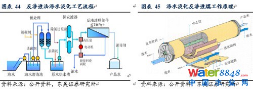 海水淡化的主要產(chǎn)業(yè)化的主要有海水反滲透法和熱力淡化法。反滲透法首先將海水提取進行預(yù)處理降低濁度,然后用特種高壓泵增壓使海水進入反滲透膜,在反滲透膜中完成淡化后含鹽量大大降低,消毒后可供居民引用。隨著膜材料的不斷改進和膜價格的下降,反滲透法逐漸成為海水淡化主流技術(shù),反滲透海水淡化應(yīng)用30年來,能耗降低了三分之二。截止2010年底,在全球已建成的海水淡化裝機容量中,反滲透法所占比例最高為60%,蒸餾法所占比例為34.8%,其他方法合計約5%。