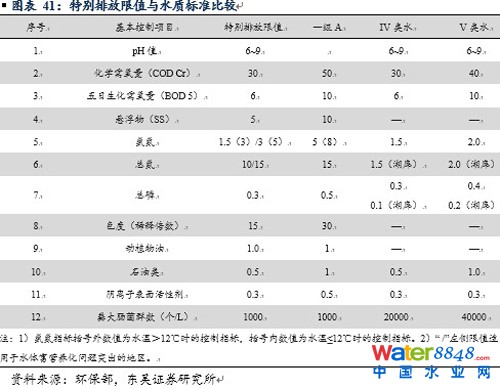 除總氮等指標外,特別排放限制的要求與地表水IV類相當,大大高于一級A標準,符合“水十條”提高水質(zhì)標準戰(zhàn)略要求(一級A標準要低于V類水,“水十條”要求2020年京津冀區(qū)劣V類水體斷面比例下降15個百分點左右,長三角、珠三角區(qū)域力爭消除劣V類水體,各地可根據(jù)水環(huán)境質(zhì)量改善需要擴大特別排放限值實施范圍)。