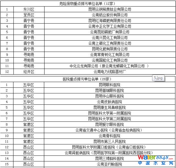 從名單可看出,131家重點(diǎn)排污單位中包含了1家廢水重點(diǎn)排污單位、11家廢氣重點(diǎn)排污單位、16家污水處理廠重點(diǎn)排污單位、63家重金屬企業(yè)重點(diǎn)排污單位、12家危險(xiǎn)廢物重點(diǎn)排污單位和28家醫(yī)院重點(diǎn)排污單位。其中,東川區(qū)的重點(diǎn)排污單位最多,共有61家;經(jīng)開區(qū)最少,只有一家。另外,度假區(qū)、宜良縣也相對較少,度假區(qū)有兩家、宜良縣有兩家。