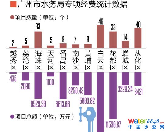 從《市級財(cái)政專項(xiàng)資金預(yù)算表》附表中的工程項(xiàng)目說明中可以統(tǒng)計(jì)得出,廣州市各區(qū)的治水工程側(cè)重在什么方面。比如,從化區(qū)40個項(xiàng)目中有超過20個是水庫安全達(dá)標(biāo)加固工程,工程師對水庫大壩進(jìn)行培厚加固整治,具體包括防滲、除險、水庫達(dá)標(biāo)加固庫容。海珠區(qū)的33個項(xiàng)目中則有21個項(xiàng)目內(nèi)容涉及河涌清淤,其中包括沙滘涌、竹洲河、洪福圍涌、頭圍涌、西頭涌等。