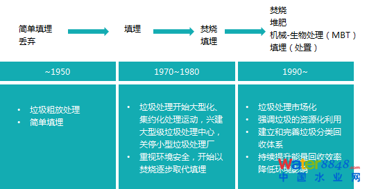 概括而言,在治理思路上,發(fā)達(dá)國家所走過的路有這樣幾個(gè)大的趨勢(shì):逐步取代/淘汰填埋;集中化、大型化處理;提高資源化利用率;市場(chǎng)化(第三方處理)等。