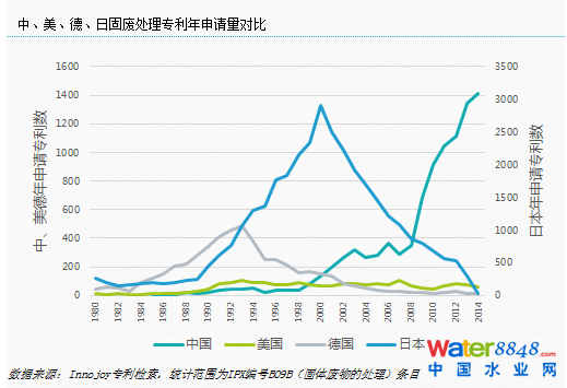 2008年后,由于社會(huì)對(duì)環(huán)保問題的關(guān)注和基礎(chǔ)設(shè)施投資建設(shè)潮的到來,我國固廢處理行業(yè)邁入一個(gè)新的階段(值得一提的是,在環(huán)保產(chǎn)業(yè)的諸多領(lǐng)域,2008都是較為特殊的一年,許多指標(biāo)都有突出的增長,這與奧運(yùn)帶來的環(huán)保話題效應(yīng)以及隨之而來的治污舉措不無關(guān)系)。工業(yè)危廢、電子廢棄物、餐廚垃圾等更加專業(yè)化和細(xì)分化的市場(chǎng)領(lǐng)域開始啟動(dòng),快速增長的市場(chǎng)容量催生出了東江環(huán)保等技術(shù)色彩更濃的上市公司。固廢處理領(lǐng)域的技術(shù)創(chuàng)新迎來了第二次爆發(fā)。目前,我國的年專利申請(qǐng)量已超過美、德、日等一眾發(fā)達(dá)國家,全球固廢領(lǐng)域技術(shù)創(chuàng)新最為活躍的國家。目前中國每年新申請(qǐng)的固廢處理相關(guān)專利在1500個(gè)左右,這一數(shù)字依然在不斷增長。