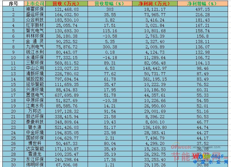 以大氣處理、凈化除塵、脫硫脫硝為主業(yè)的節(jié)能環(huán)保上市公司共有13家,其業(yè)績對比情況如下: