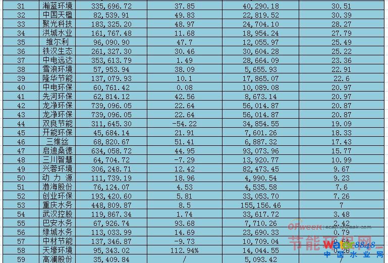 以供水、自來水、水處理、污水處理等為主業(yè)的節(jié)能環(huán)保上市公司共有29家,其業(yè)績對比情況如下: