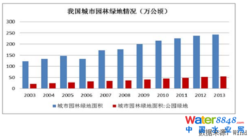 隨著城市建成區(qū)面積的不斷擴(kuò)大和公共環(huán)境的持續(xù)改善帶動(dòng)了市政園林單位投資額的逐年提升,大型公共綠地建設(shè)投資由 2003 年的 321.9 億元增加到2013 年的 1,647.4 億元, 年復(fù)合增速17.74%。 主要城市人均公園綠地面積從 2003年的 6.49 平方米增長到 2013 年的 12.64 平方米,年復(fù)合增速 6.89%。近年來,我國城市園林綠地面積和公園綠地面積分別由2003 年的121.17 萬公頃和21.95萬公頃增長至 2013 年的 242.72 萬公頃和 54.74 萬公頃,年均提高 12.15 萬公頃和 3.28 萬公頃。