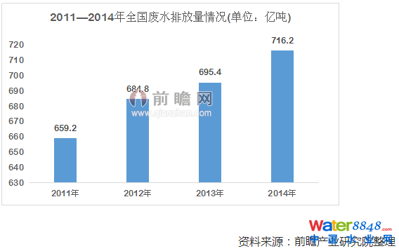 2011年,我國廢水排放總量659.2億噸,2012年為684.8億噸,2013年為695.4億噸,2014年為716.2億噸,呈現(xiàn)逐年上升的趨勢。隨著水資源日漸匱乏、水污染問題嚴(yán)重、廢水大量排出,發(fā)展污水處理迫在眉睫。