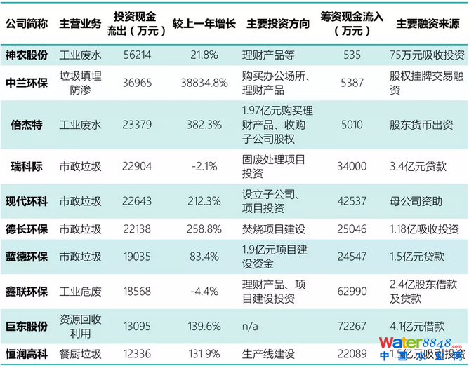 投資現(xiàn)金流出前十新三板掛牌公司投融資詳情如下: