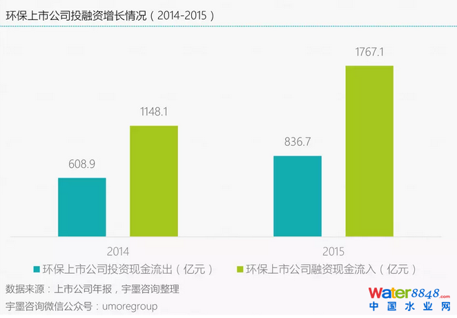 筆者以現(xiàn)金流量表中的投資現(xiàn)金流出和融資現(xiàn)金流出作為反映投融資體量情況的主要指標(biāo)。2015年317家環(huán)保上市公司融資和投資額分別是1767和837億元,較2014年同比增長高達(dá)37%和54%。在行業(yè)整體營收和增長數(shù)據(jù)并不十分理想的2015年,投融資金額取得如此可觀的增長,可以說資本時(shí)代到來的說法一點(diǎn)也不夸張。
