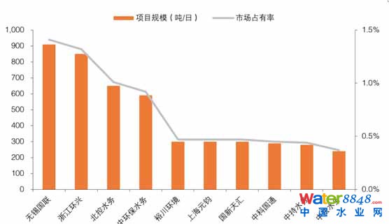 我國(guó)污泥處理行業(yè)市場(chǎng)集中度較低,專業(yè)仍事污泥處理處置的企業(yè)較少,且規(guī)模較小,未出現(xiàn)龍失企業(yè)。根據(jù)E20環(huán)境平臺(tái)的統(tǒng)計(jì)結(jié)果,截至2015年10月,各企業(yè)已運(yùn)營(yíng)的BOT、BOO、DBO、投資運(yùn)營(yíng)類項(xiàng)目處理規(guī)模,在調(diào)查企業(yè)中,無(wú)錫國(guó)聯(lián)、浙江環(huán)興和北控水務(wù)分別以1.41%、1.32%和1.01%的市場(chǎng)占有率位居榜單前3名。