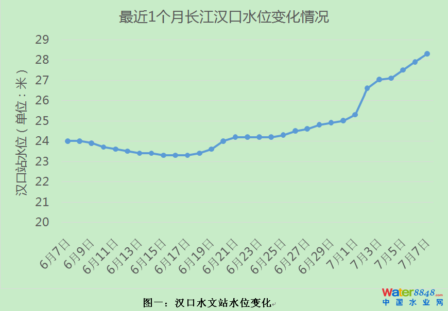 一是外江水位持續(xù)上漲,導(dǎo)致城市本身排水困難。根據(jù)長江水文網(wǎng)的數(shù)據(jù),近一個(gè)月以來漢口水文站水位變化情況如圖表所示: