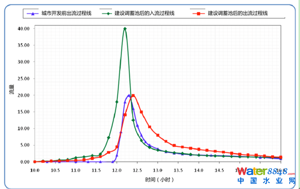 圖表三:建設(shè)調(diào)蓄池前后流量過程曲線