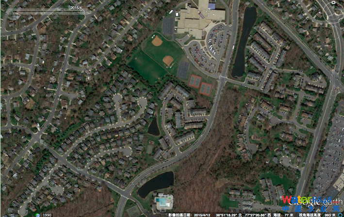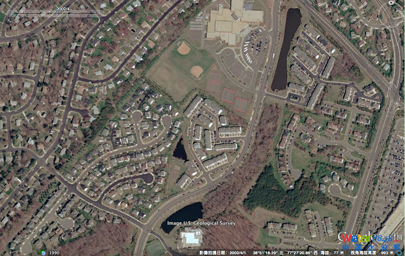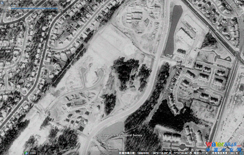 圖說:美國某典型住宅區(qū)開發(fā)中調(diào)蓄池的建設(shè)情況(注:以上衛(wèi)星影像圖片來自Google earth,該地點(diǎn)為北緯38°51’18.29”,西經(jīng)77°27’20.86”,3幅衛(wèi)星影像圖的時(shí)間分別為1990年,2002年和2015年)