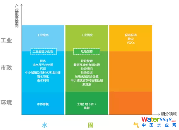 一個主要原因就是我們細分領域非常的復雜,E20提供一個九宮格分析方法,雖然不符合產(chǎn)業(yè)的分類。比如說我們這兩維,一個是水固氣,一個是工業(yè)與工業(yè)之物的市場,一個是市場服務的市場,還有一個是環(huán)境修復和環(huán)境維護為主要目標的市場。在這個橫軸上的水固氣,其實可以通過他們每一個污染介質(zhì),或者污染媒介的特性掌握他在產(chǎn)業(yè)中的企業(yè),主要面對的或者這些技術(shù)所要面對的問題。比如大氣領域,很難對大氣直接進行修復。一般存在的項目都是在我們右上角工業(yè)處理,他服務主要是EPC還有一個工程設備的空間。