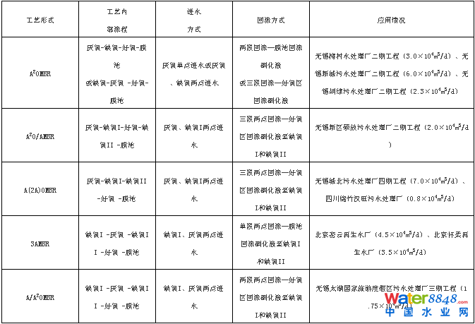 ④氣候條件等。從目前應(yīng)用的工程經(jīng)驗來看,A2O及其變形強化工藝是眾多應(yīng)用在MBR脫氮除磷工藝中處理效果最為突出,運行管理最為方便,也是最穩(wěn)定可靠的一類。表1介紹了目前各種形式的A2O及其改進型的MBR脫氮除磷組合工藝的應(yīng)用情況。