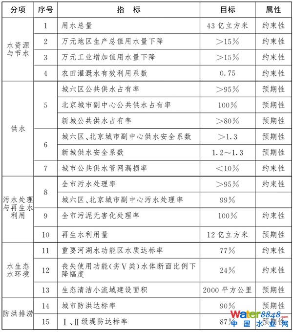 北京市水資源嚴重短缺,節(jié)約用水對城市可持續(xù)發(fā)展有重要意義。本規(guī)劃按照“十三五”時期實現主要節(jié)水指標達到全國領先、國際先進水平,并率先建成節(jié)水型社會的目標,實行工業(yè)用新水零增長、農業(yè)用水負增長、推進農業(yè)高效節(jié)水設施和農用機井計量設施全覆蓋,推廣建筑工程優(yōu)先使用再生水,推進公共生活高效節(jié)水型生活用水器具全覆蓋。
