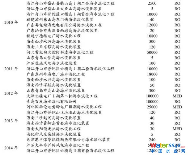 海水淡化工程主要集中在水價(jià)較高的沿海省份。已建成的海水淡化工程主要集中在水資源短缺的沿海9。禾旖颍31.73萬噸/日)、山東(16.07萬噸/日)、河北(16.87萬噸/日)、遼寧(6.82萬噸/日)、浙江(20.18萬噸/日)、廣東(8.17萬噸/日)、福建(1.17萬噸/日)、江蘇(0.51噸/日)、海南(1.14萬噸/日)。其中,北方以大規(guī)模的工業(yè)用海水淡化工程為主,主要集中在天津、河北、山東等地的電力、鋼鐵等高耗水行業(yè);南方以民用海島海水淡化工程居多,主要分布在浙江、福建、海南等地,以百噸級(jí)和千噸級(jí)工程為主。