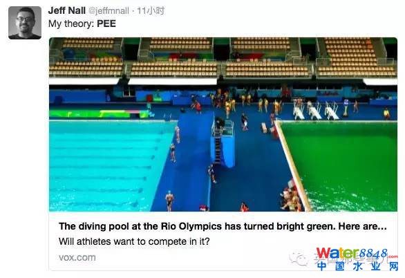 到底咋就變綠了?網(wǎng)友也開始了各種腦洞大開——有人說是巴西故意弄成綠色以此呼應(yīng)國旗的顏色;也有網(wǎng)友說,這是主辦方貼心,特地為運(yùn)動(dòng)員把泳池調(diào)成綠色,好緩解強(qiáng)日光對眼睛的刺激……