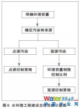 水環(huán)境工程首先需要明確環(huán)境容量,確定污染物來(lái)源,其次從點(diǎn)源和非點(diǎn)源兩個(gè)方面分別提出對(duì)策( 圖6)。點(diǎn)源控制措施主要是建設(shè)傳統(tǒng)污水系統(tǒng),通過(guò)完善雨污管道建設(shè),對(duì)點(diǎn)源污染物進(jìn)行控制。在新建區(qū)域?qū)嵭型耆晡鄯至;?duì)于已建設(shè)合流制的區(qū)域,短期改造為截流式合流制,逐步實(shí)現(xiàn)完全雨污分流。此外,改造和新建污水處理廠,建設(shè)再生水廠。非點(diǎn)源控制措施包括兩方面的內(nèi)容:一方面,合理配置生物滯留設(shè)施,對(duì)徑流污染進(jìn)行源頭削減,可以有效削減35%~45%的徑流污染( 削減809.4 噸/ 年的COD,31.4 噸/ 年的NH3-N,916.3噸/ 年的SS,4.5 噸/ 年的TP);另一方面,設(shè)置人工濕地系統(tǒng),對(duì)超出環(huán)境容量的剩余污染負(fù)荷進(jìn)行處理( 共處理1324.2 噸/ 年的COD,52.6 噸/ 年的NH3-N,1454.54 噸/ 年的SS,7.5 噸/年的TP)。