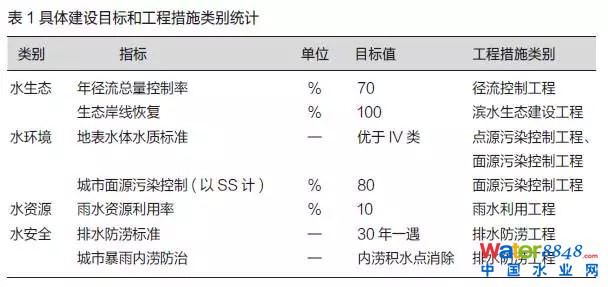 為了有效指導(dǎo)工程建設(shè),需要首先確定建設(shè)目標(biāo)。規(guī)劃參考住房和城鄉(xiāng)建設(shè)部發(fā)布的《海綿城市建設(shè)績(jī)效評(píng)價(jià)與考核辦法( 試行)》,結(jié)合區(qū)域的實(shí)際情況,分別從水安全、水環(huán)境、水生態(tài)和水資源等方面確定了總體建設(shè)目標(biāo),并明確了完成該類(lèi)目標(biāo)的具體工程措施類(lèi)別( 表1)。