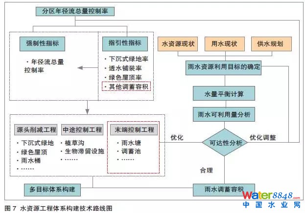 水資源工程體系的構(gòu)建主要分為雨水資源利用目標(biāo)的確定、水量平衡計(jì)算、雨水可利用量分析及可達(dá)性分析四個(gè)步驟( 圖7)。首先,根據(jù)本地水資源現(xiàn)狀資料、現(xiàn)狀用水?dāng)?shù)據(jù)及供水規(guī)劃,初步明確雨水利用方式和雨水資源利用目標(biāo)。其次,基于下墊面數(shù)據(jù)、降雨和蒸發(fā)的相關(guān)資料,對(duì)區(qū)域進(jìn)行全年水量平衡計(jì)算。最后,針對(duì)雨水利用對(duì)象,進(jìn)行雨水可利用量分析,基于低影響開(kāi)發(fā)雨水調(diào)蓄工程進(jìn)行可達(dá)性分析,校核是否滿(mǎn)足雨水利用目標(biāo)。若出現(xiàn)雨水資源利用量過(guò)大的情況,應(yīng)優(yōu)化調(diào)整雨水資源利用目標(biāo)和雨水調(diào)蓄工程,直到校核完成,得到雨水調(diào)蓄容積,構(gòu)建水資源與水生態(tài)多目標(biāo)體系。通過(guò)在綠地、道路、建筑與小區(qū)布置不同類(lèi)型的雨水資源利用和調(diào)蓄設(shè)施,并對(duì)景觀水體進(jìn)行改造,發(fā)揮調(diào)蓄功能,最終實(shí)現(xiàn)129.1 萬(wàn)立方米的調(diào)蓄容積。