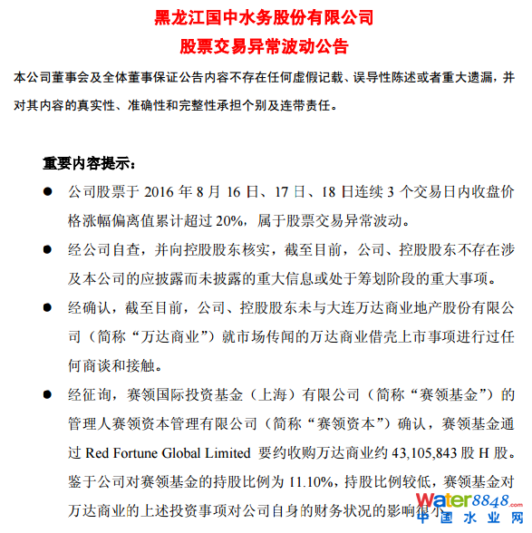 8月19日 國(guó)中水務(wù)發(fā)布公告稱 , 未與萬(wàn)達(dá)商業(yè)就市場(chǎng)傳聞的借殼上市進(jìn)行過任何商談和接觸。