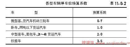 11.0.2.7 停車場車位數(shù)的確定以小型汽車為標準當量表示,其它各型車輛的停車位,應按表11.0.2中相應的換算系數(shù)折算。