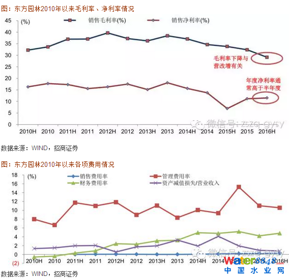 2016年上半年,東方園林綜合毛利率為29%,比上年同期下降4.7個百分點,但這一毛利率下降與2016年開始執(zhí)行的“營改增”有關,并非公司項目盈利能力下降所至。營改增自2016年5月開始執(zhí)行,而5、6月正逢公司收入確認高峰,因此對公司上半年收入仍有較大影響,導致毛利率下滑。