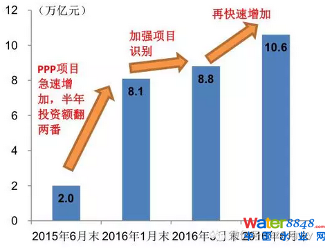 2015年初,市場對PPP的認知仍停留在想象階段,2015年底,PPP模式已開始變得更為實際。從2015年6月到2016年3月,我國PPP項目庫中項目投資額大幅增加,半年時間達到8萬億規(guī)模,截至2016年3月末,全國PPP綜合信息平臺項目庫入庫項目7721個,總投資8.8萬億元。截至2016年6月末,全部入庫項目9285個,總投資10.6萬億元;以執(zhí)行階段項目數(shù)與準備、采購、執(zhí)行等3個階段項目數(shù)總和的比值計,入庫項目的落地率為23.8%,比3月末落地率再高出2個百分點。其中,財政部示范項目232個,總投資額8025.4億元,處于執(zhí)行階段項目3078億元,落地率達48.4%,比3月末的35.1%增長13.3個百分點,正加速落地。PPP大時代已經(jīng)到來。