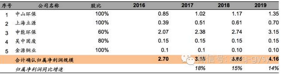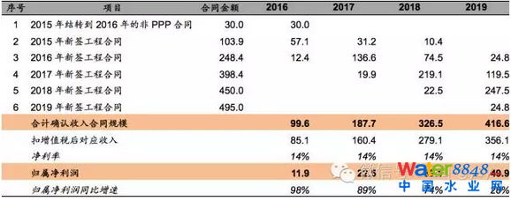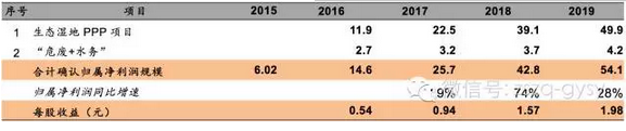 此外,公司2015年大舉并購,進軍危廢和鄉(xiāng)鎮(zhèn)水務等環(huán)保行業(yè)其他領域,2016-2017年,按照并購公司利潤承諾給予計算,2018年-2019年,則根據(jù)危廢處理能力提升的預期進度,鄉(xiāng)鎮(zhèn)水務市場的增長速度進行估算,得出危廢、水務貢獻收入利潤情況。