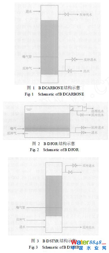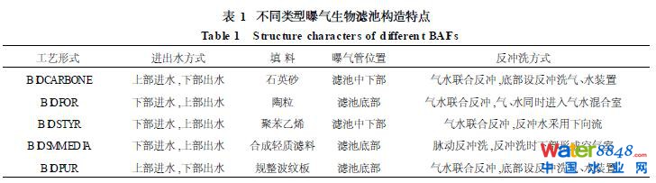 近年來(lái)曝氣生物濾池發(fā)展迅速,工藝形式不斷推陳出新, 曾先后出現(xiàn)過(guò)B IOCARBON、B IOFOR、B IOSTYR、B IOSMED I、B IOPUR、COLOX、DeepBed等形式,其中B IOCARBON、B IOFOR、B IOSTYR、B IOS2MED I、B IOPUR是現(xiàn)代曝氣生物濾池幾種典型的運(yùn)行工藝, 在世界范圍內(nèi)都有應(yīng)用, 其構(gòu)造特點(diǎn)見(jiàn)表1。B IOCARBON (圖1)為早期開(kāi)發(fā)的工藝形式,現(xiàn)在曝氣生物濾池則多采用B IOFOR (圖2)和B IO2STYR (圖3)形式。